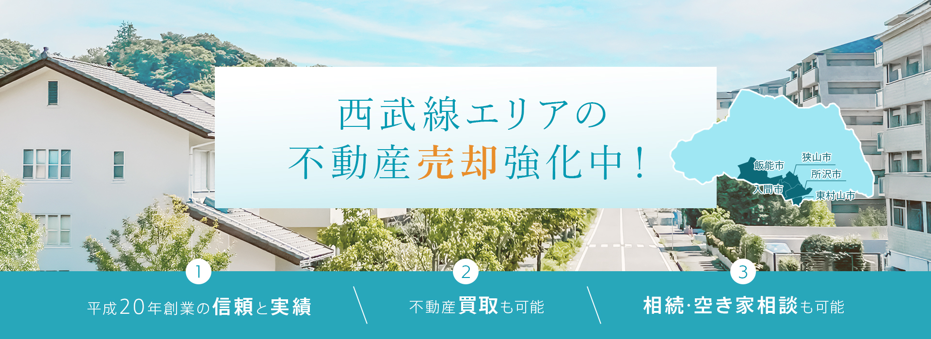 都心部へのアクセスが約30分の東京多摩地域や所沢市をはじめ、都会の喧騒を忘れられる自然豊かな住環境が魅力的な入間市や飯能市、狭山市といった埼玉県南西部エリアの不動産物件情報を豊富に取り揃え、地域密着型の弊社ならではの情報力ときめ細やかなサービスでお客様をサポート。