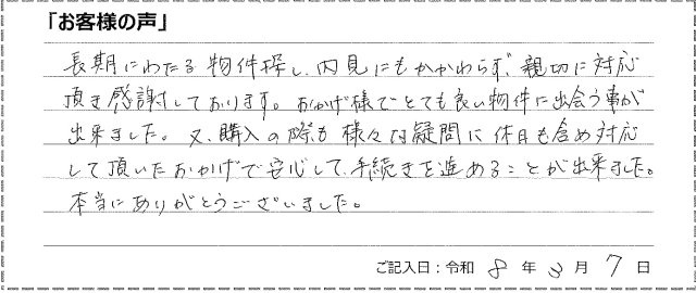 長期にわたる物件探し、内見にもかかわらず、親切に対応頂き感謝しております。おかげ様でとても良い物件に出会う事が出来ました。又、購入の際も様々な疑問に休日も含め対応して頂いたおかげで安心して手続きを進めることが出来ました。本当にありがとうございました。